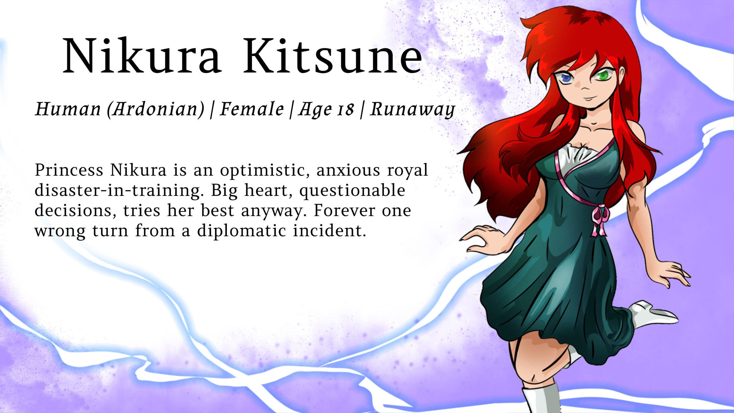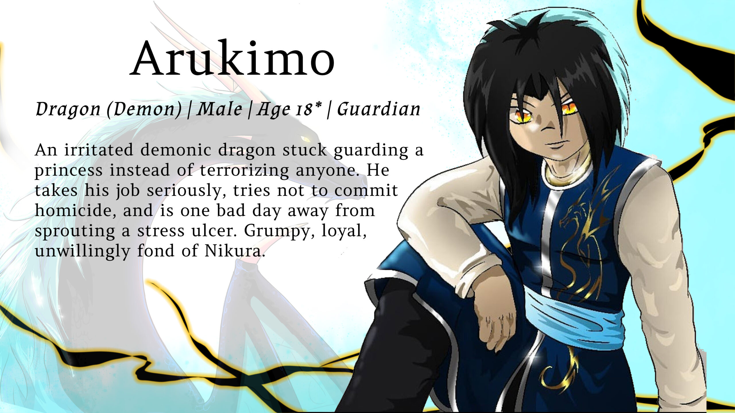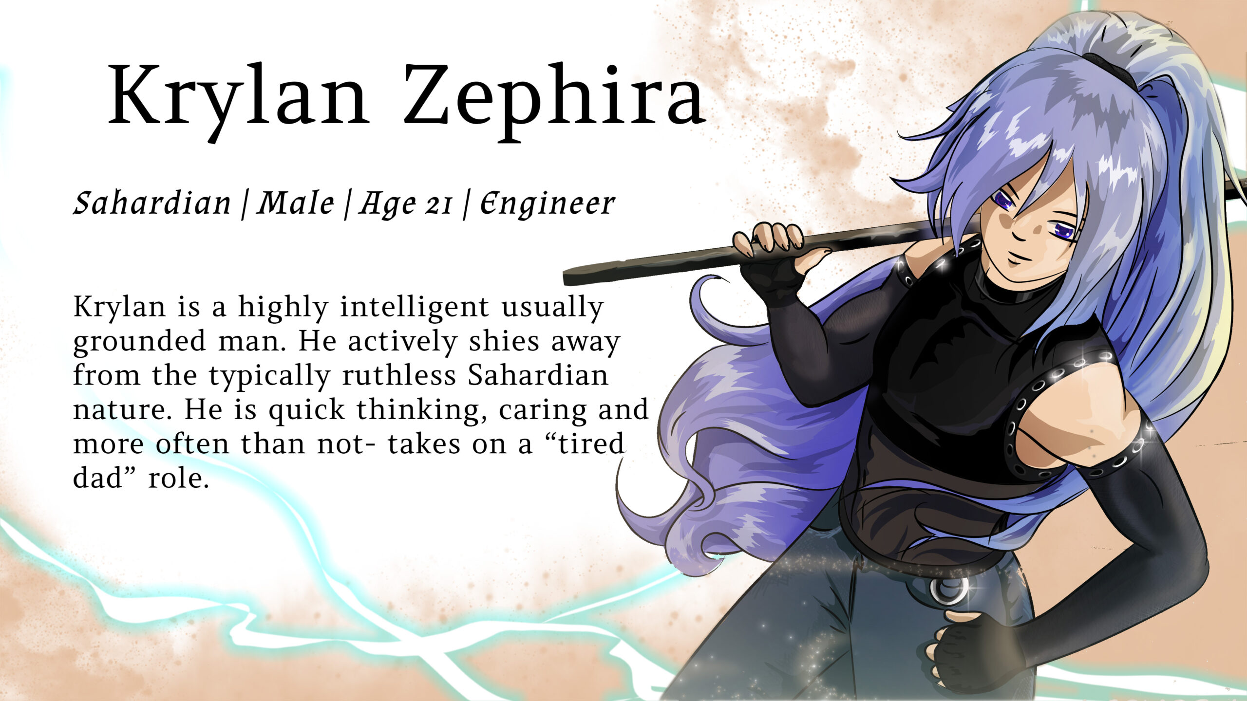 Krylan is a highly intelligent usually grounded man. He actively shies away from the typically ruthless Sahardian nature. He is quick thinking, caring and more often than not- takes on a “tired dad” role.