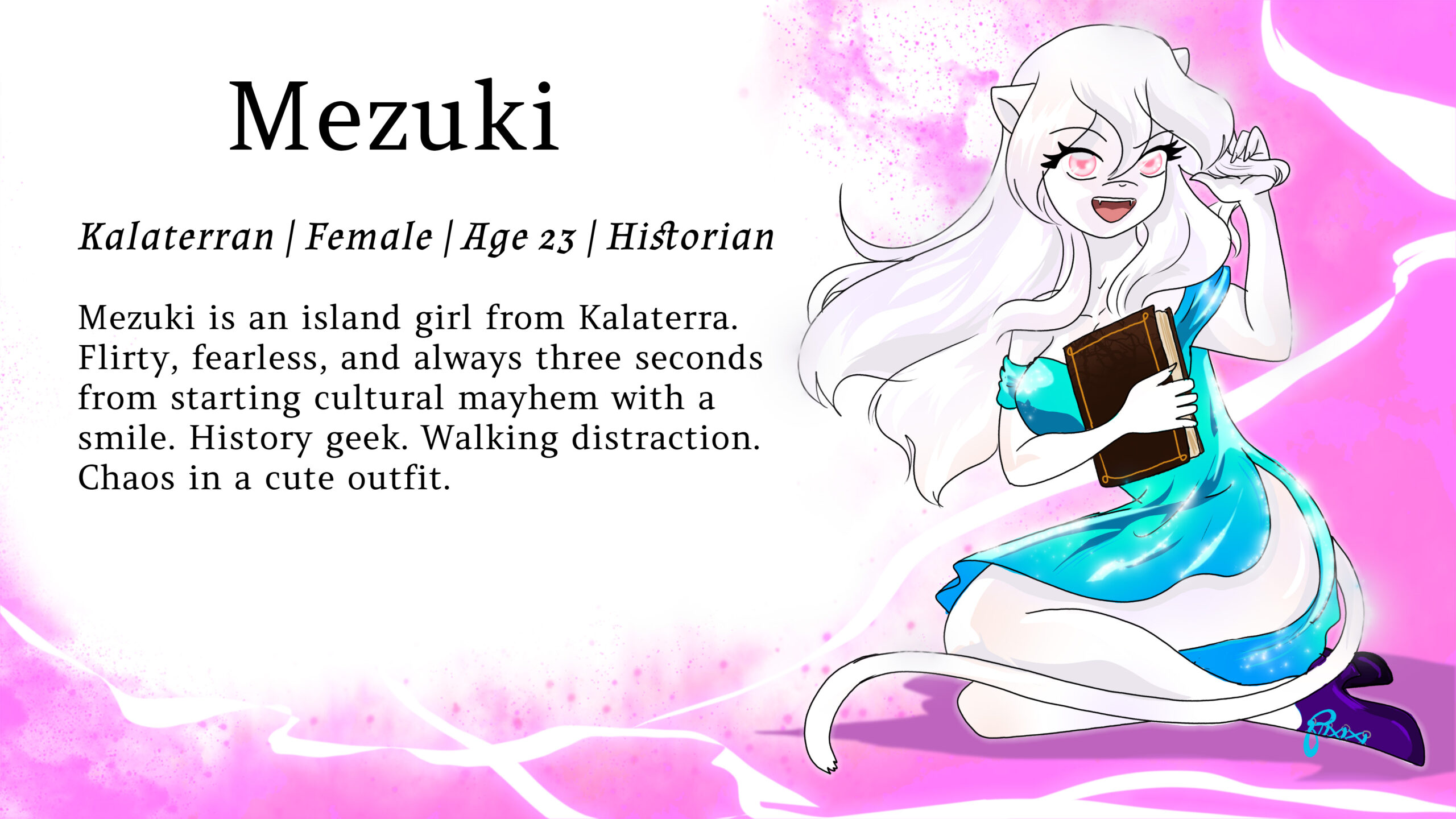 Mezuki is an island girl from Kalaterra. Flirty, fearless, and always three seconds from starting cultural mayhem with a smile. History geek. Walking distraction. Chaos in a cute outfit.